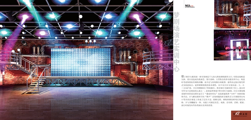位于教学大楼顶部一座可容纳近千人的大跨度钢构圆形大厅,可惜高度略显欠缺。设计改造成为集演艺、影片放映,大型集会的多功能实训中心。构思时考虑保留原有钢构顶棚,故不足与传统舞台相配偕,最终决定按后现代样式为创意原点,延伸钢架构筑的基本调性,从中央台区分别向前、左、右三方向扩展。并在两侧辅设了四块辅台,将音响灯光操纵置于其上,演出时可作为丰富视觉的元素之一,前部延伸则是T型台的灯光悬架。台后天幕处敷设制作的管道交错区延引了“蓬皮杜码头”高技派建筑和“LOFT”风格的装饰手法,并与解决圆形空间“聚声”音效难题的折音板样式与空调箱型出风口等共同在视觉上形成了层次丰富,梁梯交错、钢构纵横的鲜明后现代风格,并与顶棚融为一体。功能上可满足综艺、戏曲、音乐剧、话剧、摇滚、流行时装发布等各类演出实训的需要。