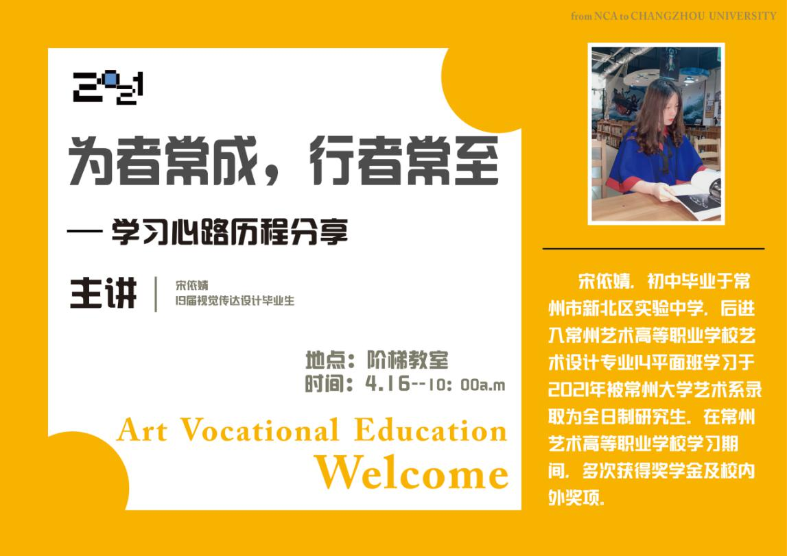 4月16日上午,常高艺艺术设计系邀请14平面班优秀校友宋依婧在综艺楼阶梯教室为设计系学弟学妹们作了题为“为者常成,行者常至”的讲座,艺术设计系师生近150人参加了讲座。 宋依婧校友首先回顾了当年在常高艺求学的青葱岁月,并与在座师生分享了她奋斗历程和成功经验,激励学弟学妹们树立正确的人生目标,树立信心,把握学习机会,充分享受“快乐学习、幸福学习”,让自己成为一专多能复合型人才。 本次讲座是本年度艺术设计系设计师巡讲季之优秀校友故事系列活动之一,旨在通过校友事迹分享,增强学生生自我规划意识和对未来职业发展的认知。后续,艺术设计系还将邀请更多杰出校友回校开讲。(艺术设计系 平面教研室)
