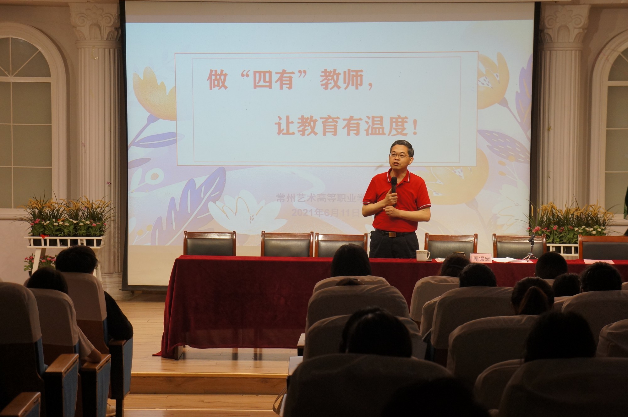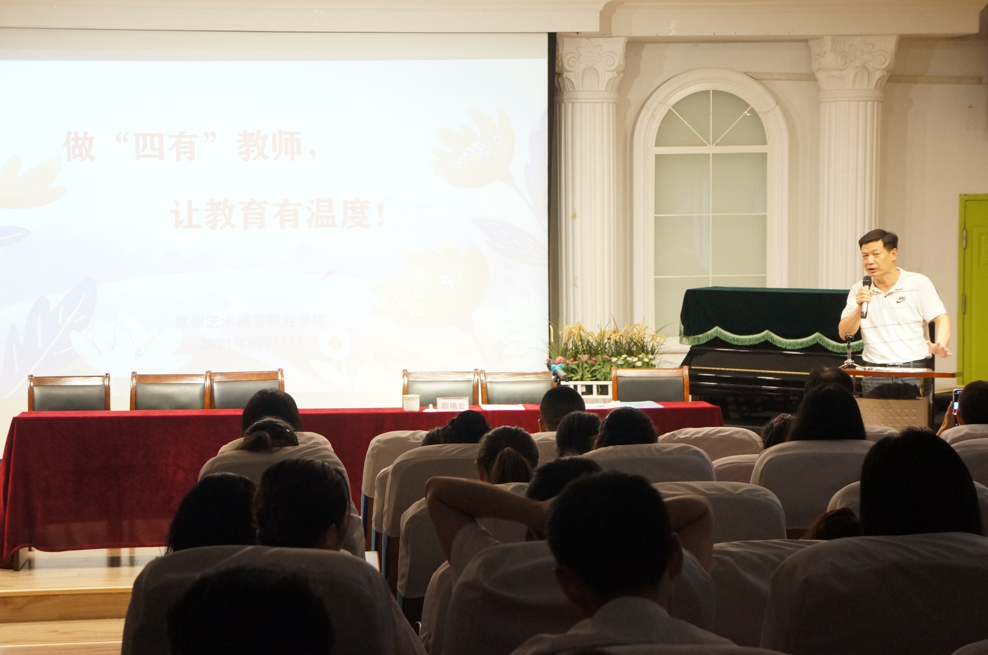 6月11日下午1:30,开云手机登录入口师德师风建设专题培训会在综艺楼阶梯教室召开,全体校领导班子、教职员工和学生代表出席会议,大会由史冲副校长主持。 会上,高慰校长首先做动员讲话。高校长结合十九届五中全会精神和古往今来有关师德师风的名人名言,阐述了建设高质量教师队伍,加强师德师风建设的重要性,强调师德师风建设是百年大计,要常抓不懈,号召广大教职员工要以此次培训会为契机,不断学习,从严要求,真正做到学高为师,身正为范。 接下来,江苏省社会教育专家、常州市特级校长、常州开放大学校长顾锡宏为全体教职工做了题为《做“四有”教师,让教育有温度》的专题讲座。顾校长结合自身经历,从教师的幸福感来自哪里?教师的责任在哪里?教师的价值在哪里?做一个什么样的教师?四个方面阐述了师德师风建设的重要性和如何加强师风师德建设。 办公室张茹主任宣读了《开云手机登录入口关于成立师德师风建设工作督导组的通知》,周婧、吴倩倩、朱杰三位3位教师代表也结合自身实际,分享了自己对师德师风建设的理解和教育教学过程中如何按照师德师风要求,严于律己,争当师德表率的心得体会。学生代表赵慧也上台发言,对学校老师们严格遵守师德规范,用爱育人,建设有温度校园表达了感激之情,并表示在今后的学生班主任助理工作中,继续传承发扬老师们的优秀品德。 杭国金副校长从明确教师职责使命、把握五年制高职师德师风建设要求、严守《开云手机登录入口师德考核负面清单》16个底线、合力培养良好的师德师风四个方面学习、解读了国家有关师德师风建设法律法规和学校制定的相关制度。 最后,全体教职工面向国旗,进行庄严的师德师风承诺宣誓。 近三个小时的培训,内容丰富,教职工收获满满,纷纷表示今后一定严于律己、恪守底线、敬业爱生,坚守知行合一,为国育人的初心,争做新时代“四有”教师。(校办 张经亮)
