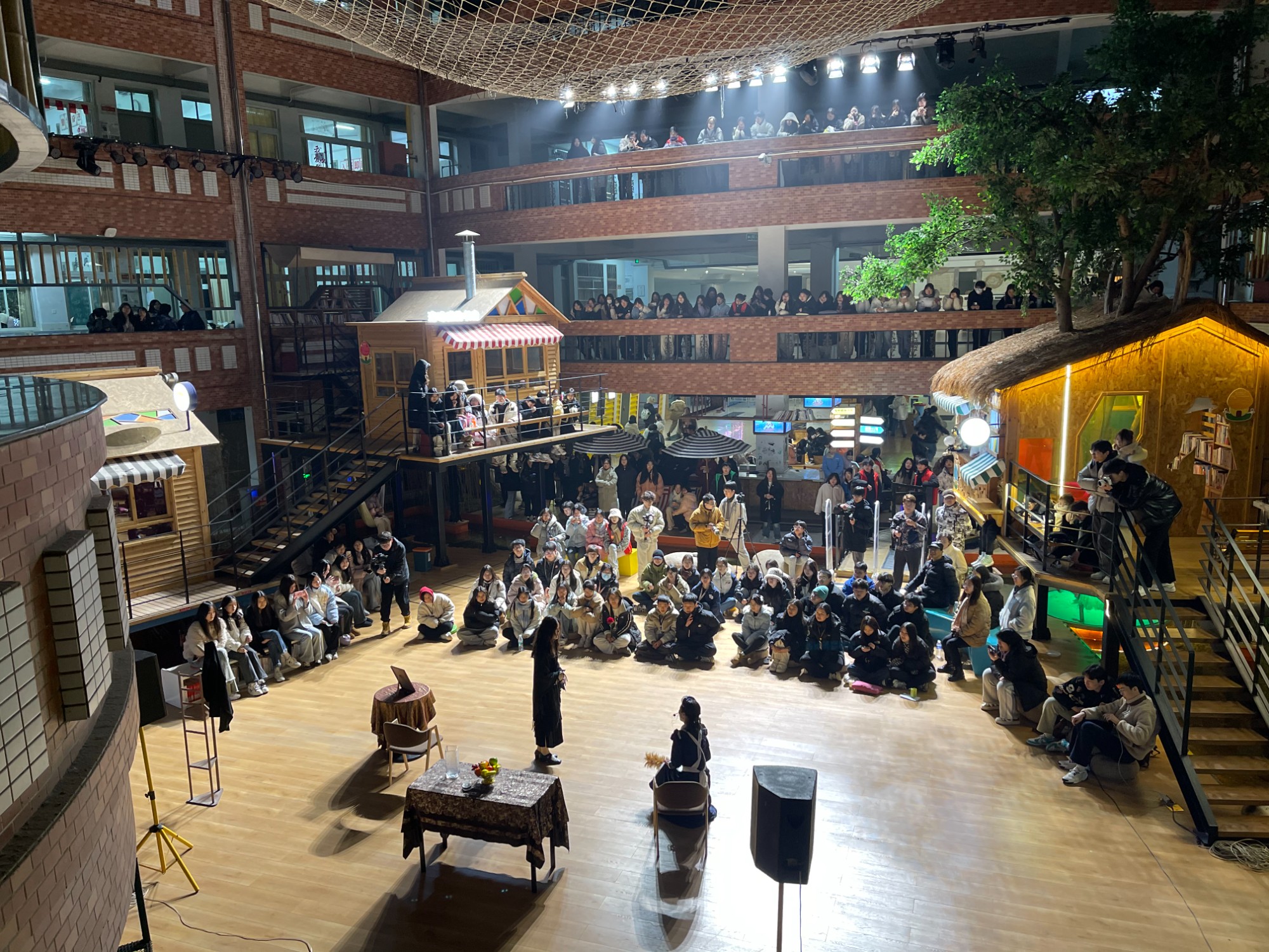2024年1月3日晚19:30,常州市首家沉浸式话剧演艺剧团——酹江月沉浸式话剧社走进常高艺校园,沉浸式喜剧《破旧的别墅》《蠢货》在教学楼中厅蓝海书岛进行上演。 沉浸式话剧与学校“蓝海”主题文化元素的场景相融合,灯光、景观和沉浸式的艺术展演相互映衬,打破了传统艺术展演的界限,演出现场观众热情高涨,笑声、掌声不断。 戏剧进校园是常高艺的“美育”特色之一,活动推动了优秀戏剧的传播与普及,促进优秀戏剧与学校教育课程的有机融合,助力常高艺打造以“沉浸式”演出内容为主题的产、教、研、旅融合文旅目的地。(团委)