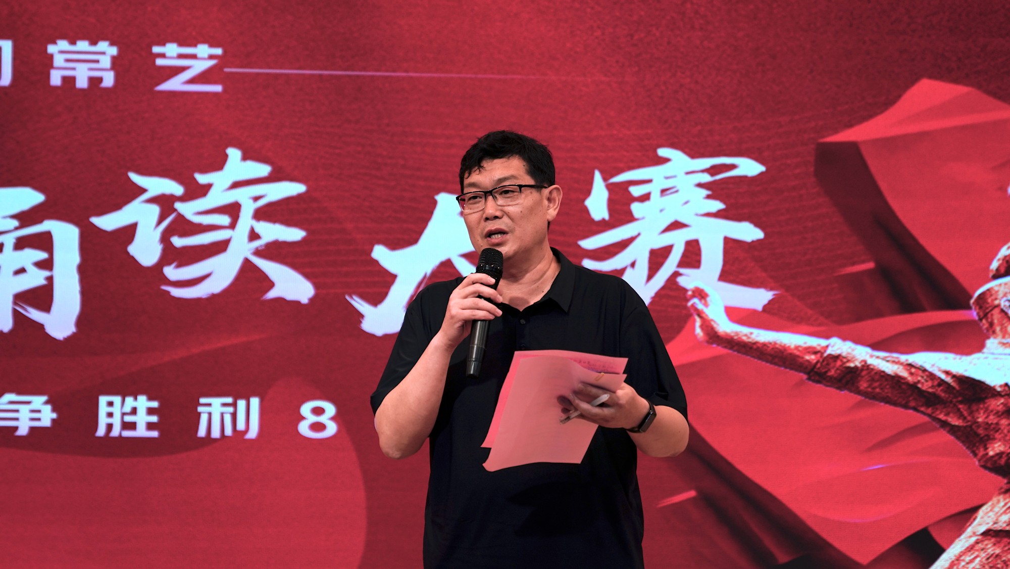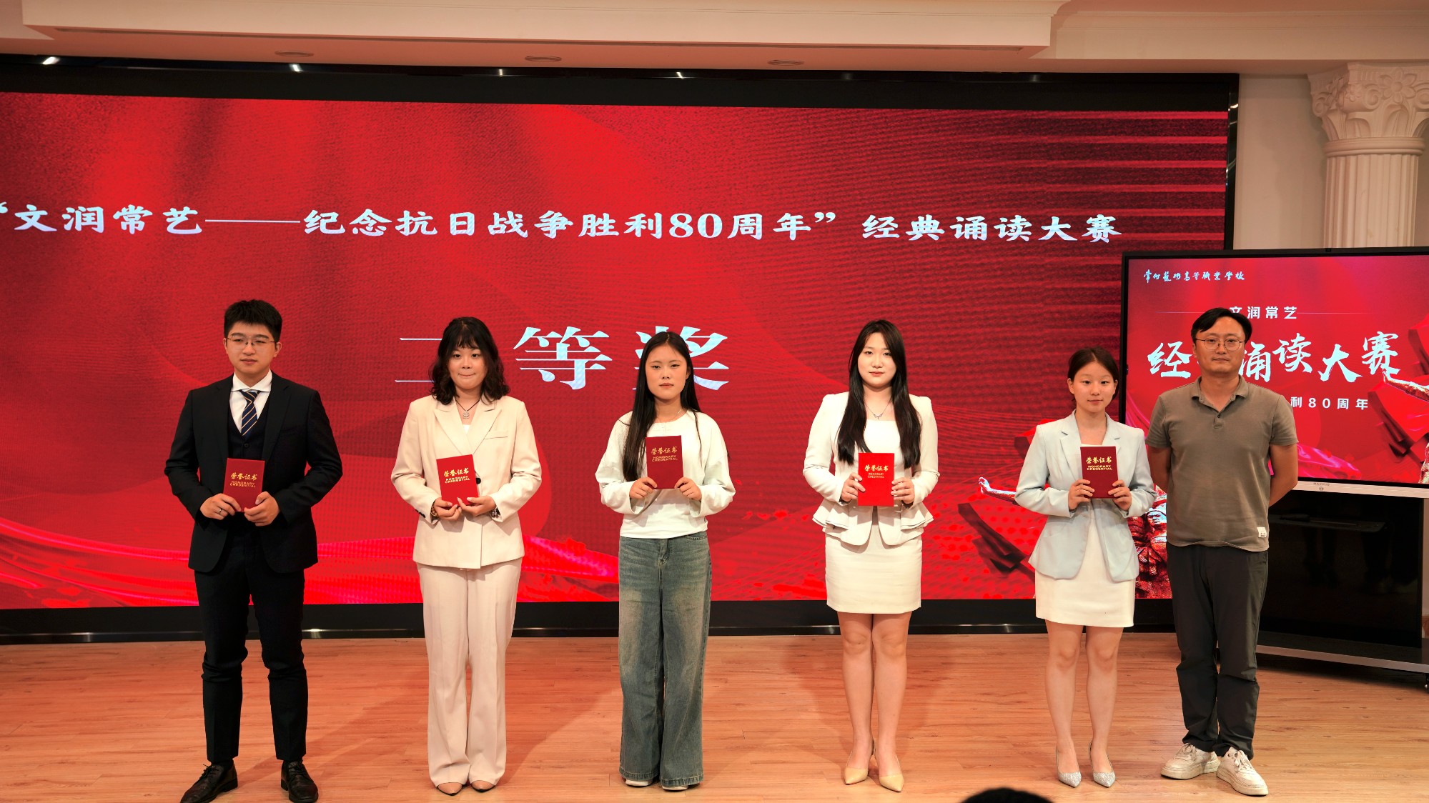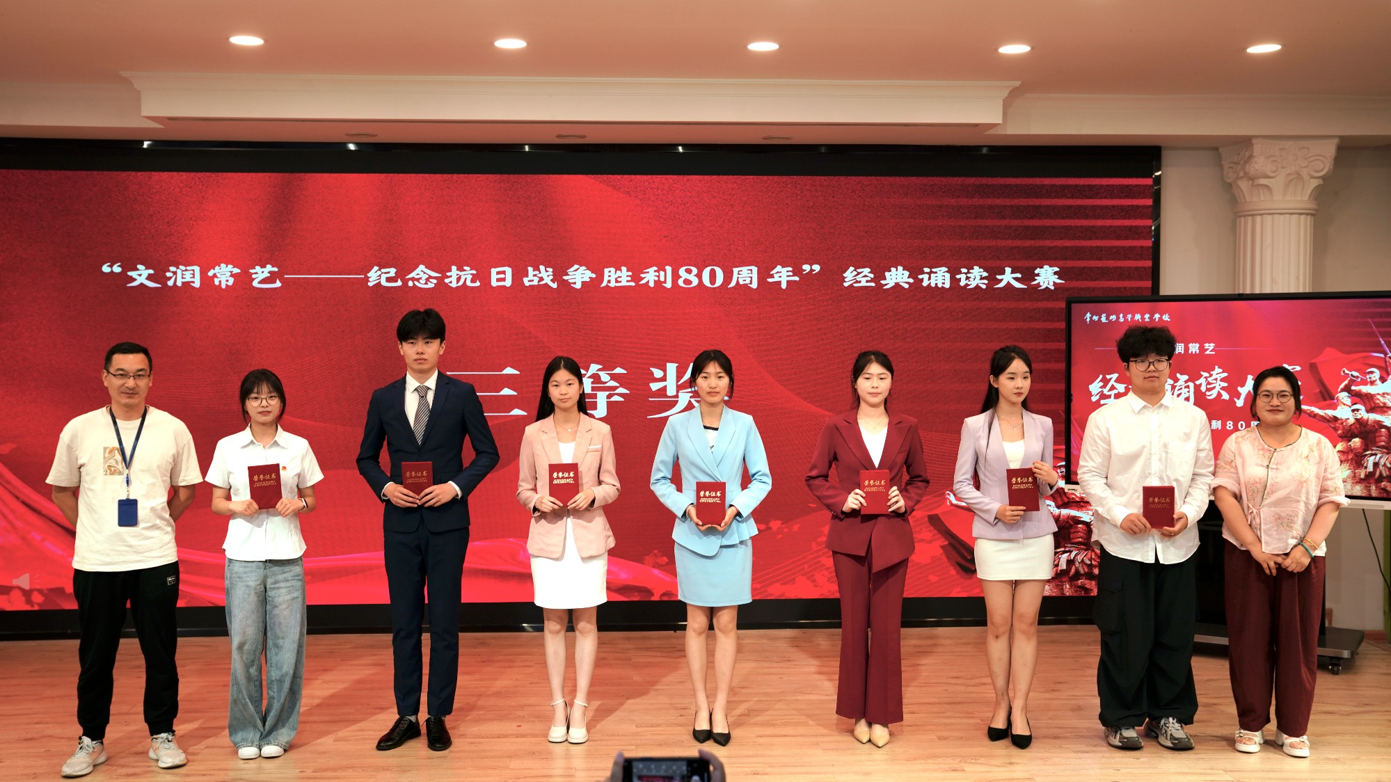 为深化爱国主义教育,传承红色基因,5月20日下午我校艺术表演系团总支联合播音教研室于阶梯教室举办"文润常艺——纪念抗日战争胜利80周年"朗诵比赛决赛。15支参赛队伍以声为媒、以诵明志,在"读书节"系列活动舞台上生动诠释红色精神,展现新时代青年的家国情怀与历史担当。