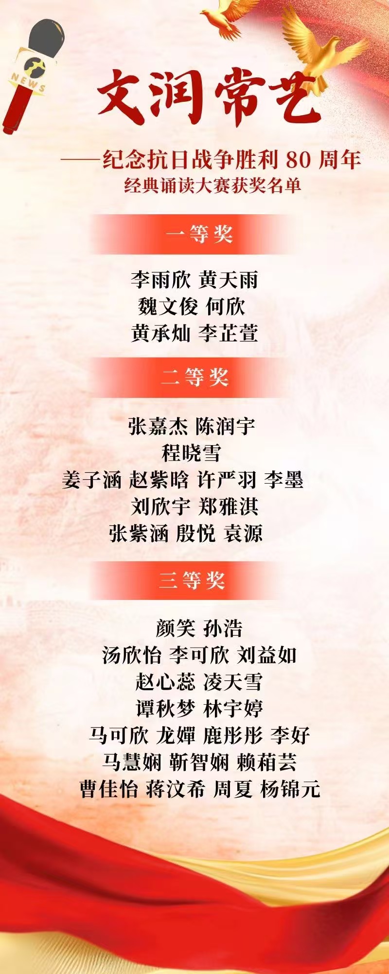 学工处长夏成晨则从育人角度阐释:本次活动作为读书节的重要载体,实现了专业教育与爱国主义教育的深度融合。不仅是对专业技巧的考验,更是对人民史观的深刻认知。 赓续红色血脉 经过激烈角逐,获奖学生名单如下:
