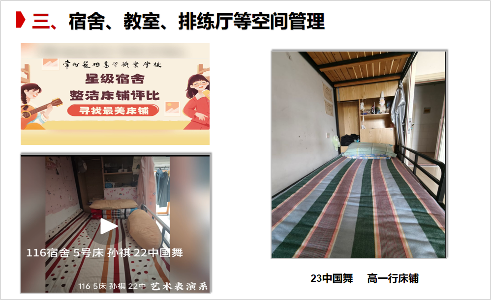 两位同学的床铺被评为系部“最美床铺” 任主任立足专业特色,对同学们提出具体要求。他强调,课堂学习是根基,课后自主训练是关键,尤其是舞蹈等技能型专业,必须做到“日日练、时时勤”。他鼓励同学们制定个性化训练计划,充分利用课余时间提升专业水平,为未来的升学与就业打下坚实基础。