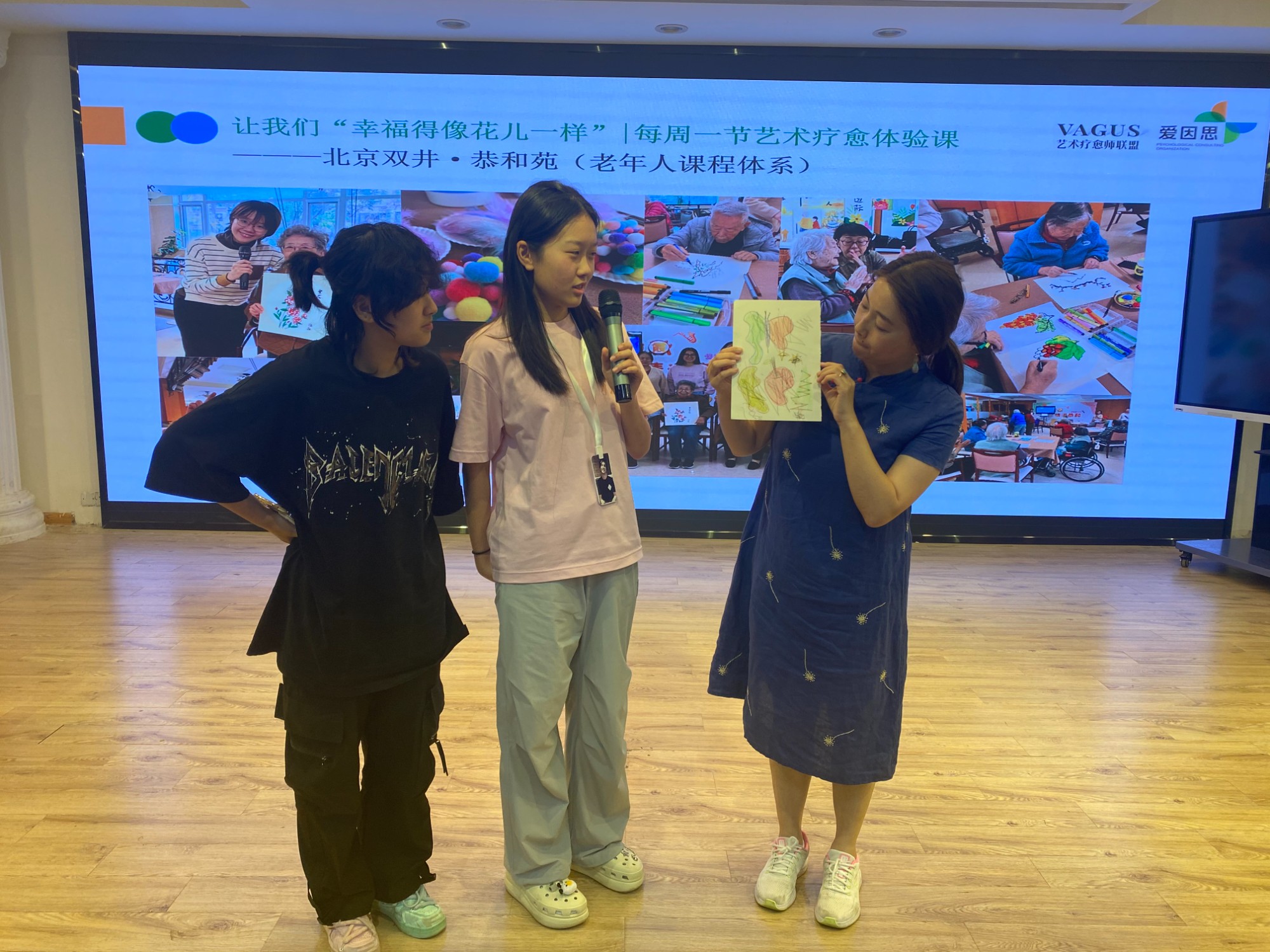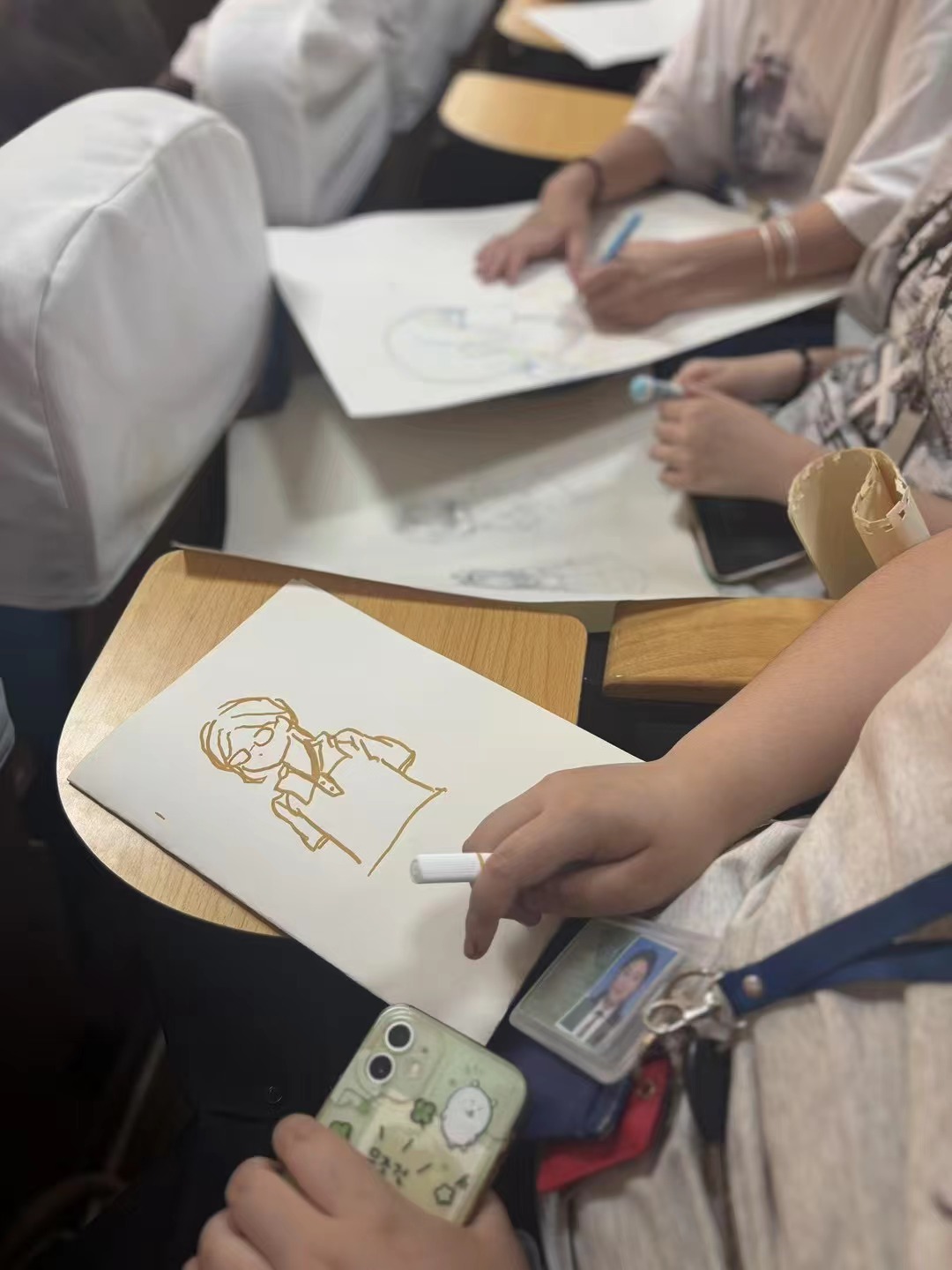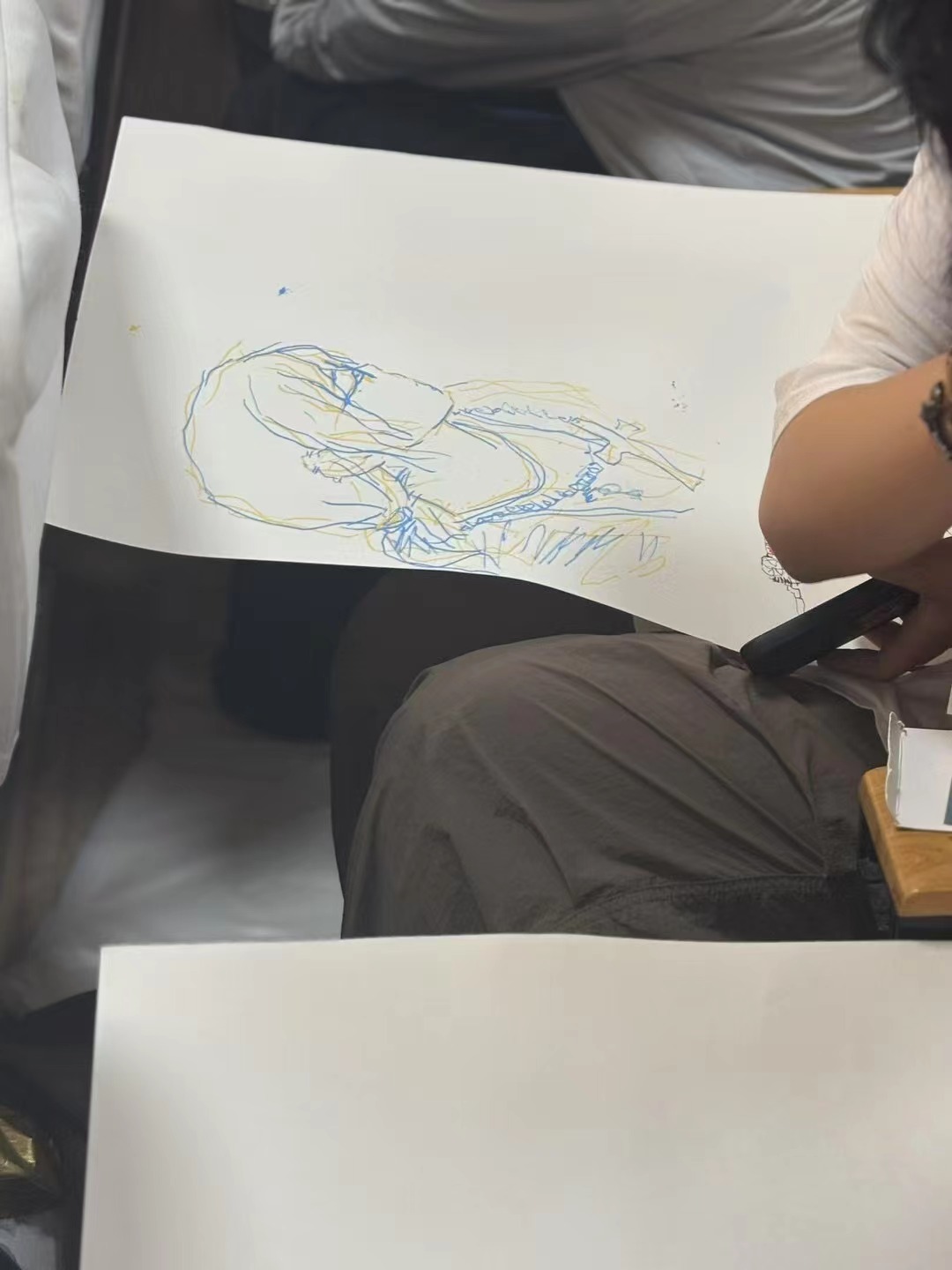 讲座伊始,小米老师凭借其深厚的学术积淀,系统阐释了艺术疗愈的核心原理与实践方法。她明确指出艺术教育与艺术疗愈的本质区别,并围绕绘画治疗、音乐治疗、舞蹈治疗、戏剧治疗及赏画治疗五大模块,结合曼陀罗绘画的起源、心理学发展脉络及潜意识理论,深入浅出地勾勒出艺术疗愈的完整图景。 在体验环节,小米老师让学生两人一组搭档进行即兴绘画体验。学生选择信任的伙伴自由组合,在舒缓的音乐中迅速进入深度放松状态,相互交换用左手画对方的脸部特征。随后,请同学上台展示自己创作的内容并请对方反馈绘画的特征是否与自己相符。在接下来的两人一组体验创作中,一人扮演领导者,一人扮演跟随者,跟随只需跟着领导者的创作进行线条、方向、图案的绘画,随后交换角色。完成后再次邀请同学进行体验分享,表达在这个过程中的感受与想法。整个过程直观呈现每位参与者的潜意识情绪状态,为参与者提供了深刻的自我认知与情感释放的机会,形成了“表达-反馈-觉察”的完整疗愈闭环。